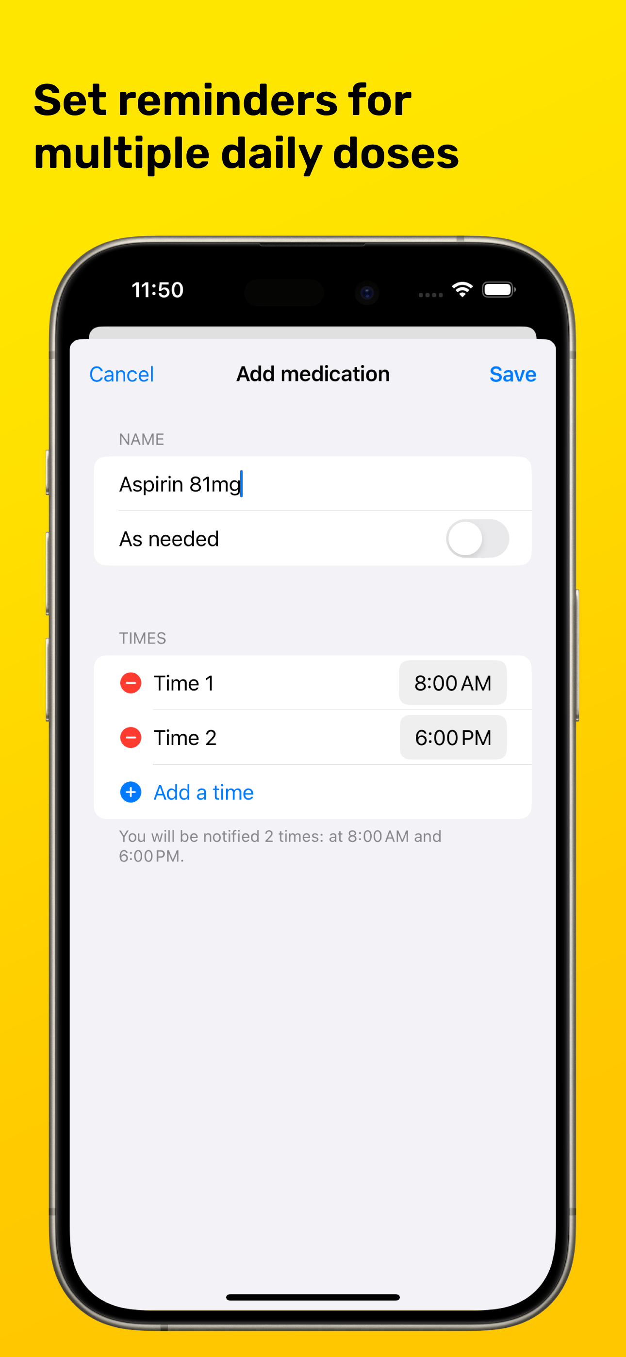 Pillbug can notify you up to 6 times daily to remind you to take medications. We set out to solve a problem that other medication reminders have: you don’t have to prove you took a medication to mark the reminder as complete. This leads to at least a couple bad scenarios: