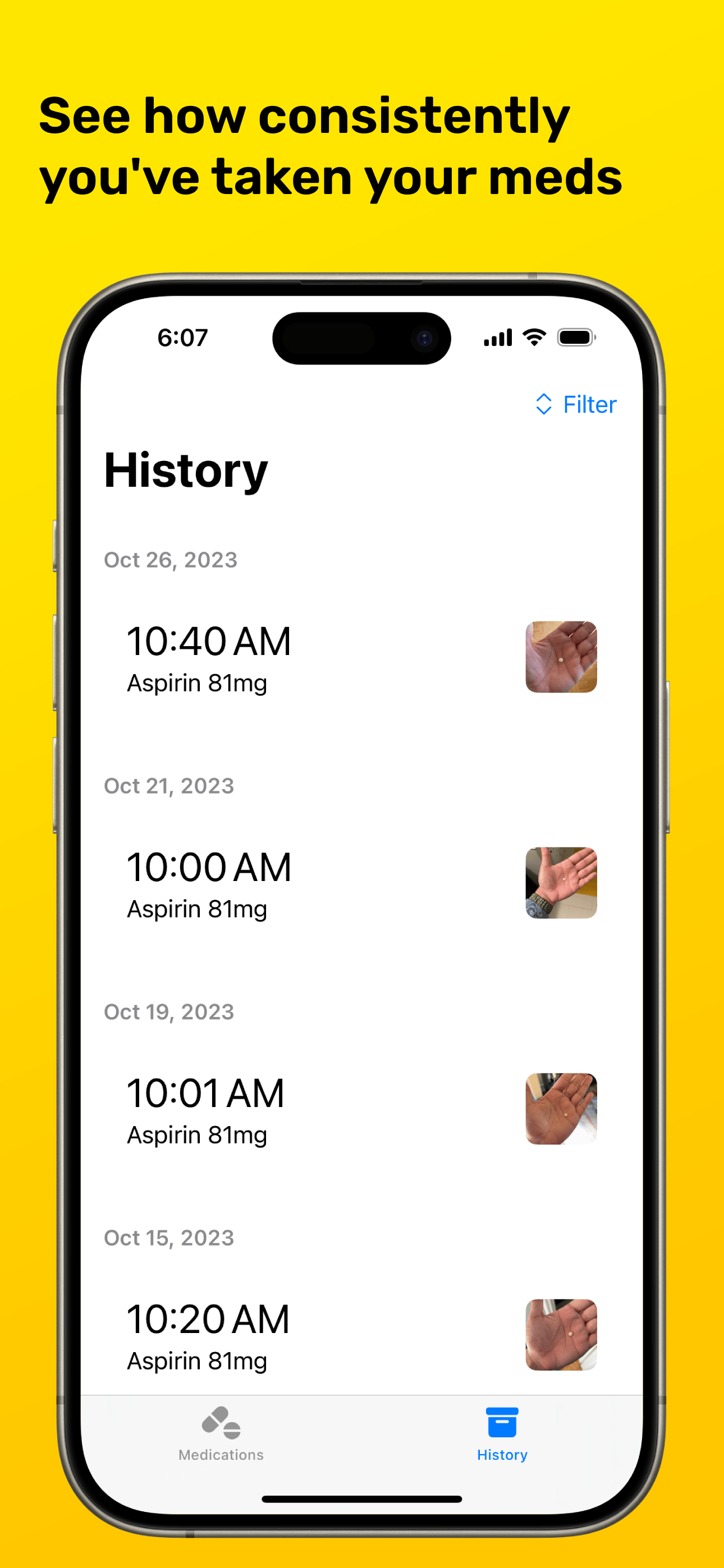 Pillbug solves these problems by logging medication doses with a picture! Take a picture of the pill in your hand or a selfie taking a sip of water afterwards. This encourages you to actually take your medication before logging your doses as complete. And you can easily check your history of pictures to reassure yourself that you’re staying on top of your medications.